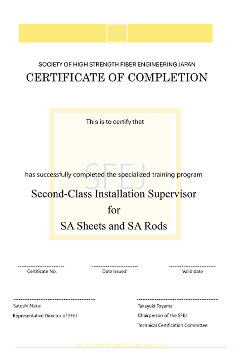 General incorporated association organization of High-Strength Fiber Engineering Japan(SFEJ)aims to promote aramid fiber reinforcement methods , trains and certifies “High-Strength Fiber Installers” and “High-Strength Fiber Installation Supervisors” as engineers and technicians who have a certain level of technology and skills related to high-strength fiber reinforcement work.